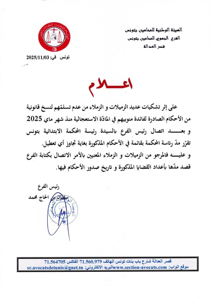 وفق النص الإعلامي الصادر بتاريخ اليوم الإثنين 3 نوفمبر، تلقى الفرع الجهوي للمحامين بتونس تشكيات من لسان الدفاع بخصوص عدم الاستجابة لمطالب التمكين من نسخ لقضايا استعجالية لحرفائهم.