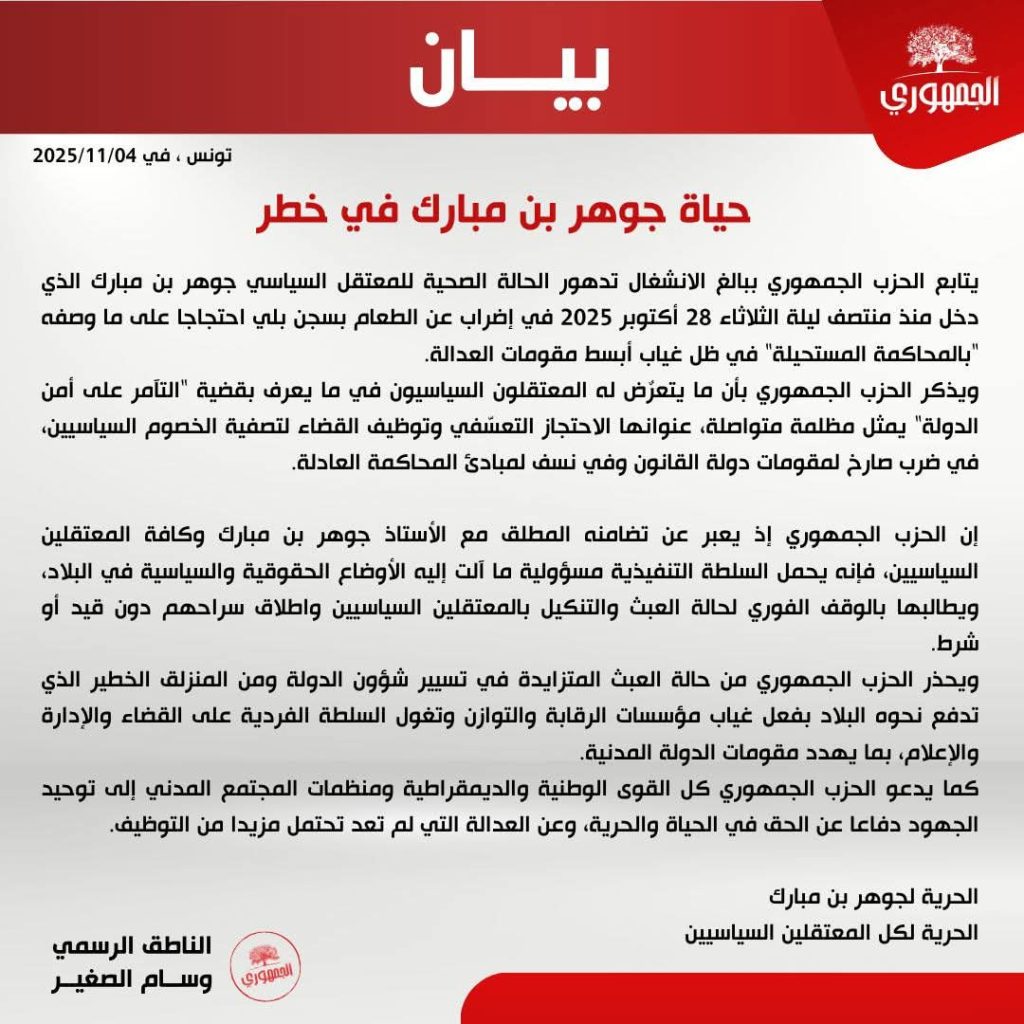 يتابع الحزب الجمهوري ببالغ الانشغال تدهور الحالة الصحية للمعتقل السياسي جوهر بن مبارك الذي دخل منذ منتصف ليلة الثلاثاء 28 أكتوبر 2025 في إضراب عن الطعام بسجن بلي احتجاجا على ما وصفه “بالمحاكمة المستحيلة” في ظل غياب أبسط مقومات العدالة.