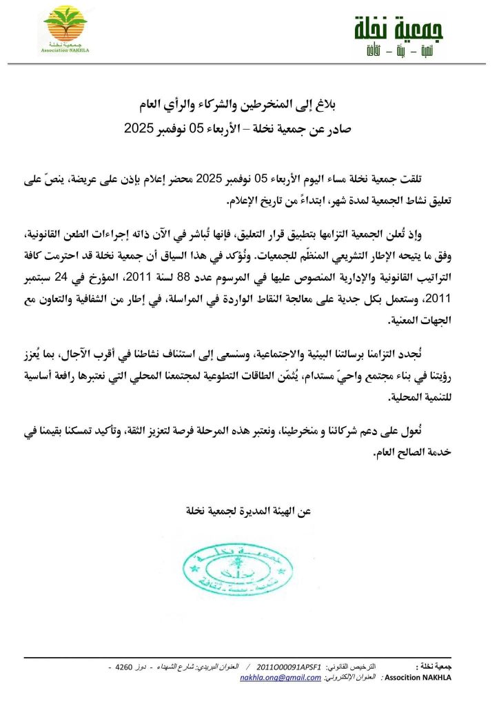 تلقت جمعية نخلة مساء اليوم الأربعاء 05 نوفمبر 2025 محضر إعلام بإذن على عريضة، ينصّ على تعليق نشاط الجمعية لمدة شهر، ابتداءً من تاريخ الإعلام.
