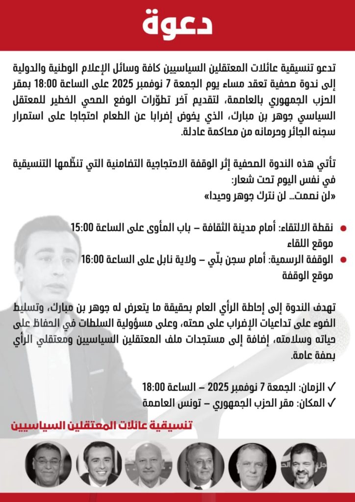 تدعو تنسيقية عائلات المعتقلين السياسيين كافة وسائل الإعلام الوطنية والدولية إلى ندوة صحفية تعقد مساء يوم الجمعة 7 نوفمبر 2025 على الساعة 18:00 بمقر الحزب الجمهوري بالعاصمة، لتقديم آخر تطوّرات الوضع الصحي الخطير للمعتقل السياسي جوهر بن مبارك، الذي يخوض إضرابا عن الطعام احتجاجا على استمرار سجنه الجائر وحرمانه من محاكمة عادلة.