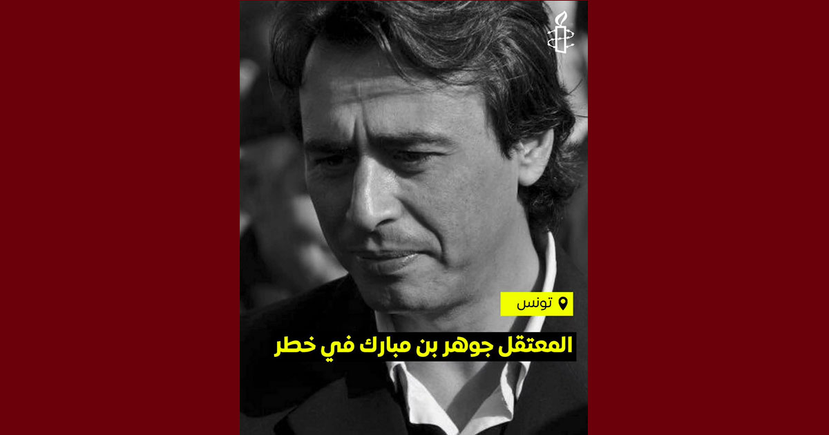 تعرب منظمة العفو الدولية تونس عن قلقها العميق إزاء الوضع الصحي الحرج للمعتقل السياسي جوهر بن مبارك، المضرب عن الطعام منذ أكثر من أسبوع احتجاجًا على اعتقاله التعسفي والحكم الجائر الصادر بحقه في ما يُعرف بقضية “التآمر على أمن الدولة”.