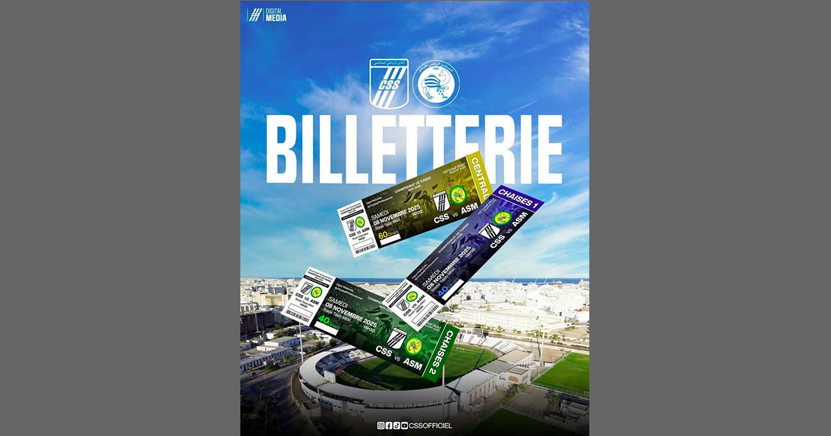 بمناسبة مباراة الجولة 14 ذهاب من بطولة الرابطة المحترفة الأولى لكرة القدم والتي ستجمع النادي الرياضي الصفاقسي بالمستقبل الرياضي بالمرسى يوم السبت 8 نوفمبر 2025 بداية من الساعة الثانية والنصف بعد الزوال، نعلم جماهيرنا أنه تم طرح تذاكر من فئة: