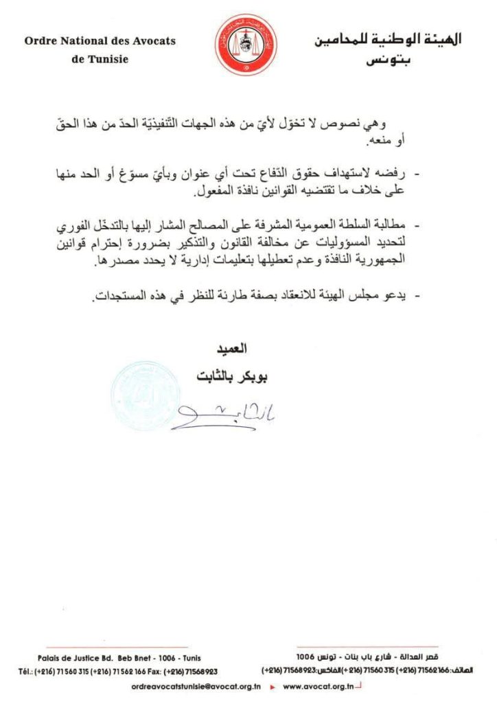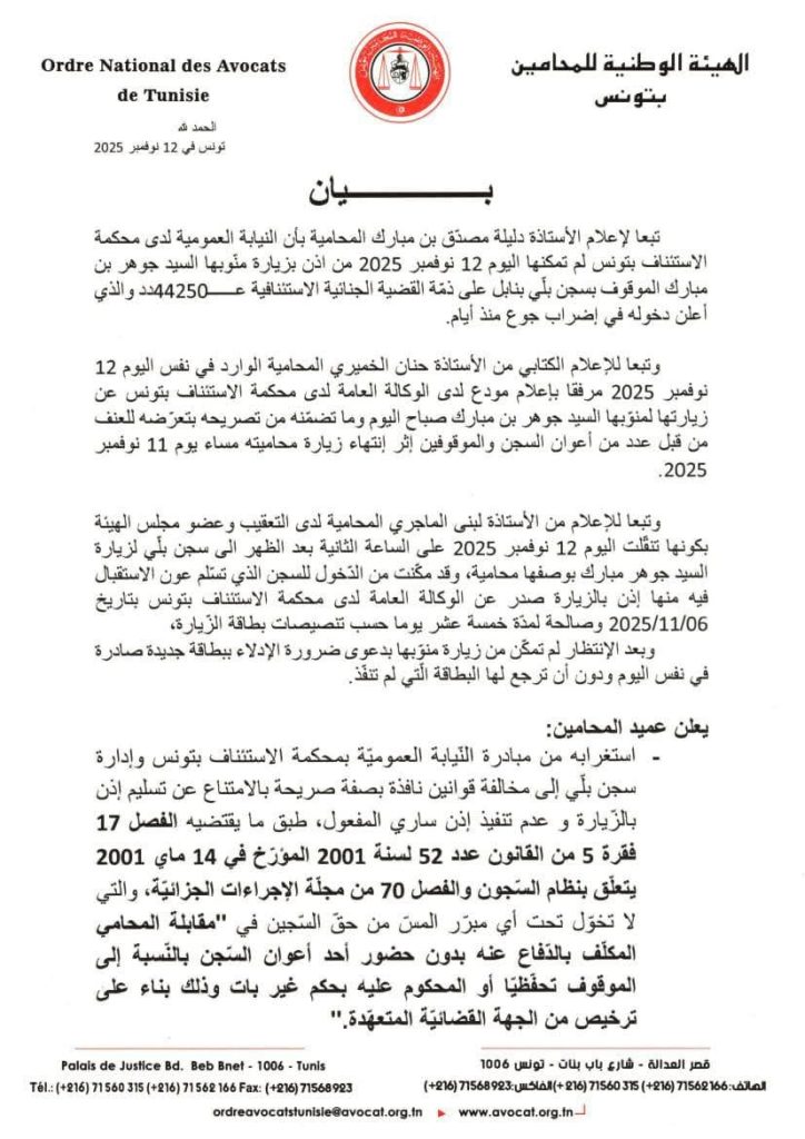 وعبّر عميد المحامين عن استغرابه من مبادرة النيابة العمومية بمحكمة الاستئناف بتونس وإدارة السجن بمخالفة قوانين نافذة بالامتناع صراحة عن تسليم إذن بالزيارة وعدم تنفيذ إذن ساري المفعول، وفقًا لما يقتضيه الفصل 17 والفصل 5 من القانون عدد 52 لسنة 2001 المؤرخ في 14 ماي 2001 المتعلق بنظام السجون، والفصل 70 من مجلة الإجراءات الجزائية.