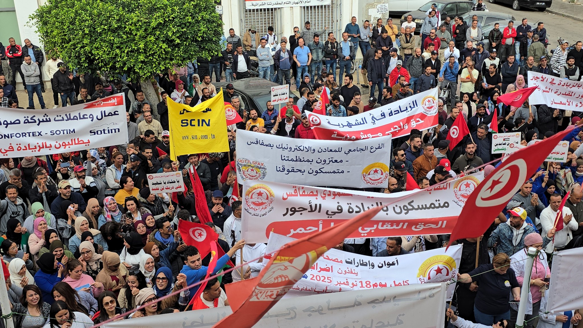 فيديو ثان: نفذ عمال ما لا يقل عن 60 مؤسسة بجهة صفاقس مسيرة تزامنًا مع الإضراب العام و ذلك احتجاجاً على “حرمان العمال من حق الزيادة في الأجور وحرمانهم من المفاوضات الاجتماعية القانونية ، في ظل غلاء متواصل للمعيشة وتدهور المقدرة الشرائية”.