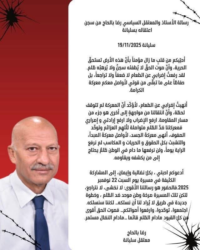 أدعوكم احبتي ، بكلّ نضالية وإيمان، إلى المشاركة الكثيفة في مسيرة يوم السبت 22 نوفمبر 2025.فالحضور هو رسالتنا الأقوى: لا نخشى، لا نتراجع، لتكن تلك المسيرة صرخة وطن موحد ضد الظلم ، وخطوة جديدة في طريق لا يُراد لنا أن نسلكه… لكننا سنسلكه.