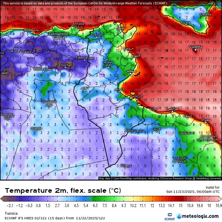 عموما الحرارة منخفضة في كامل البلاد بسبب توغل كتلة الهواء البارد القطبية و التي ساهمت في تساقط ثلوج ولاية جندوبة اليوم 22 نوفمبر 2025.