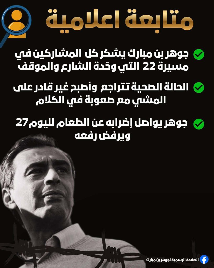 رغم الحالة الصحية المتدهورة، أستاذ القانون في الجامعات التونسية، المعتقل جوهر بن مبارك، المحكوم ب18 عاما سجنا في قضية التآمر 1، يواصل إضراب الجوع لليوم 27 و رافضا رفعه رغم تدهور حالته الصحية التي أصبحت في “تراجع و أصبح غير قادر على المشي مع صعوبة في الكلام”، وفق ما أعلنت عنه شقيقته و محاميته الأستاذة دليلة بن مبارك من خلال تدوينة نشرتها مساء اليوم على صفحات التواصل الإجتماعي، مضيفة أن ” جوهر بن مبارك يشكر كل المشاركين في مسيرة 22 التي وحدت الشارع و الموقف”.