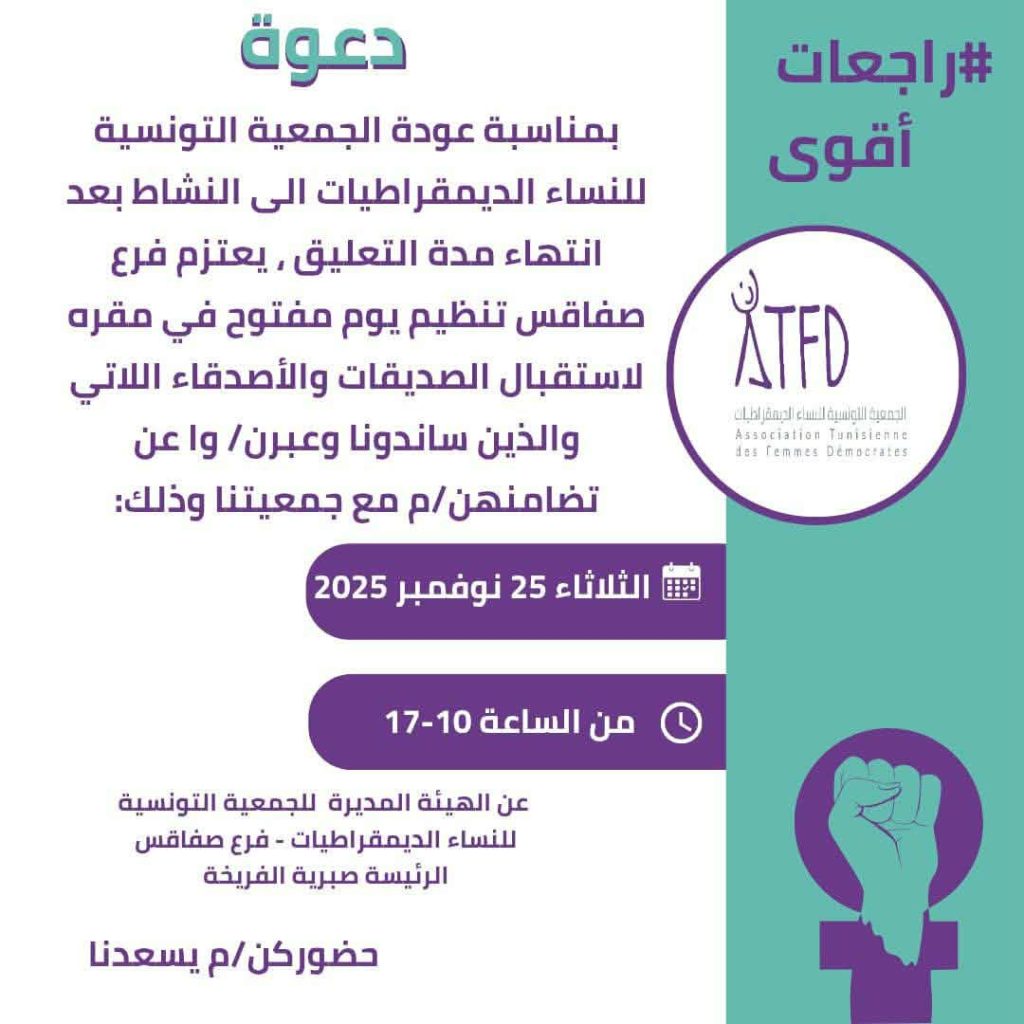 بمناسبة عودة الجمعية التونسية للنساء الديمقراطيات إلى النشاط بعد انتهاء مدة التعليق، يعتزم فرع صفاقس تنظيم يوم مفتوح في مقره لإستقبال الصّديقات والأصدقاء اللّاتي والذين ساندونا وعبرن/ وا عن تضامنهن/م مع جمعيتنا وذلك يوم غد: