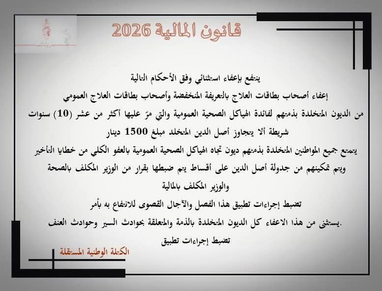 إعفاء أصحاب بطاقات العلاج بالتعريفة المنخفضة وأصحاب بطاقات العلاج العمومي من الديون المتخلدة بذمتهم لفائدة الهياكل الصحية العمومية والتي مرّ عليها أكثر من عشر (10) سنوات شريطة ألا يتجاوز أصل الدين المتخلد مبلغ 1500 دينار.