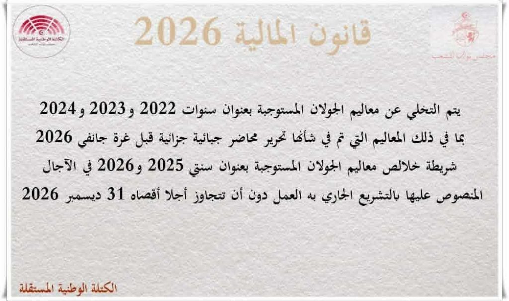 صادق مجلس نواب الشعب على إعفاء المواطنين من دفع معاليم الجولان المتأخرة عن السنوات السابقة (2022/ 2023 و2024)، مع السماح بسداد معاليم 2025 و2026 ضمن المهلة القانونية دون فرض غرامات بعد 31 ديسمبر 2026.