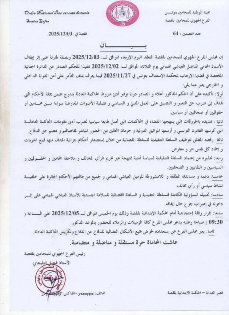 عمار عمروسية عن حزب العمال يدعو للحضور أمام ابتدائية قفصة (وثيقة)