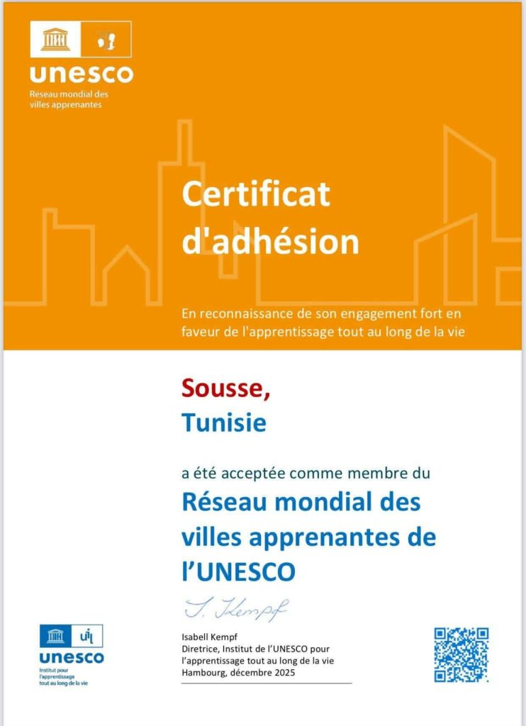 اعلنت بلدية سوسة اليوم الجمعة عن انضماممها رسميا إلى شبكة المدن التعلّمية لليونسكو، وذلك إثر الإعلان عن النتيجة الإيجابية يوم أمس.