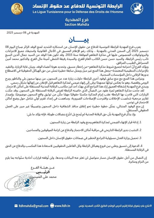 “يعرب فرع المهدية للرابطة التونسية للدفاع عن حقوق الإنسان عن استنكاره الشديد لمنع الوفد الزائر صباح اليوم 08 ديسمبر 2025 إلى السجن المدني بالمهدية ، وذلك رغم الإعلام المسبق في الآجال القانونية واستيفاء جميع الاجراءات والبروتوكولات المنصوص عليها في مذكرة التفاهم الموقعة سنة 2015. وقد تكون هذا الوفد من السيد جمال الدين السبع نائب رئيس الرابطة، والسيد حسن حسن الكاتب العام للفرع، والسيدة رفيقة الشطي أمينة مال الفرع، والدكتور محمد أمين المسراطي الطبيب المرافق.