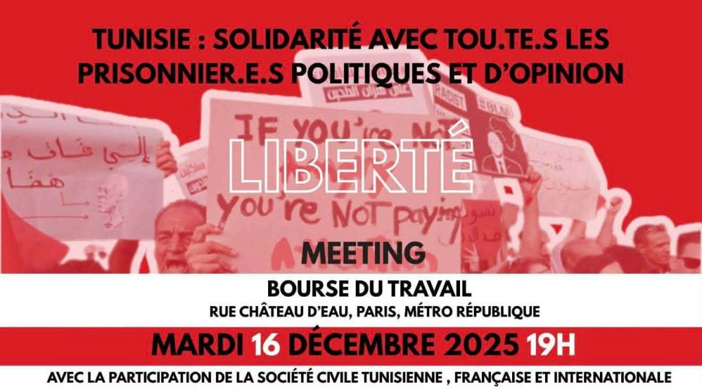 تونسسياسةباريس: دعوة للمشاركة في ملتقى تضامني مع المعتقلين السياسيين90 0 11 ديسمبر، 202511 ديسمبر، 2025 سيكون هذا اللقاء يوم الثلاثاء 16 ديسمبر بداية من الساعة السابعة مساء ببورصة الشغل بباريس، ميترو الجمهوريّة La République ، Rue Château d’Eau