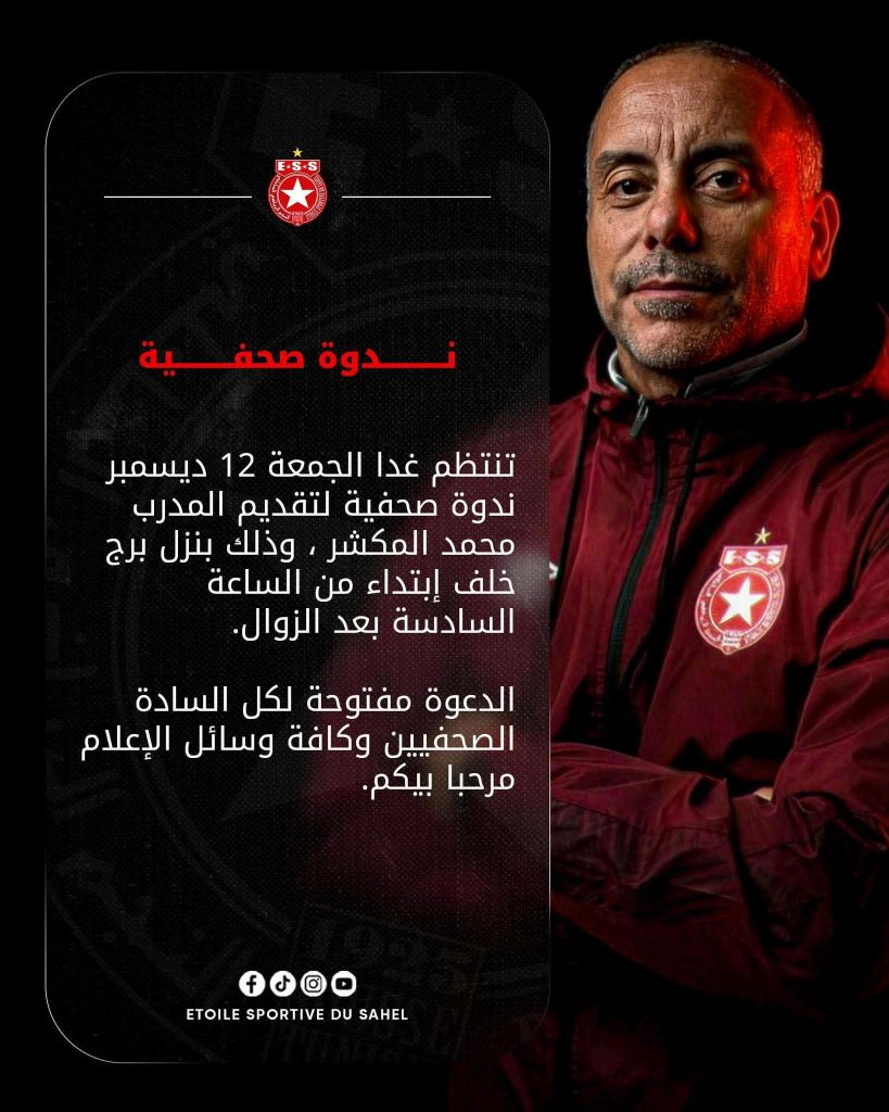 هذا و قد سبق أن أعلنت الهيئة المديرة للنجم الرياضي الساحلي عن التركيبة الرسمية للإطار الفني المرافق للمدرب الأول محمد المكشر على رأس فريق آكابر كرة القدم: