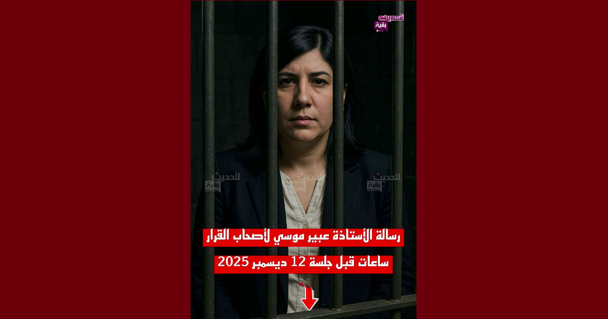 نشر الدستوري الحر مساء اليوم الخميس الرسالة التالية التي وجهتها رئيسة الحزب الأستاذة عبير موسي (المعتقلة منذ 3 أكتوبر 2023) لأصحاب القرار قبل مثولها صباح يوم الجمعة 12 ديسمبر 2025، مذكرة إياهم بمقولة ابن خلدون “الظلم مؤذن بخراب العمران :
