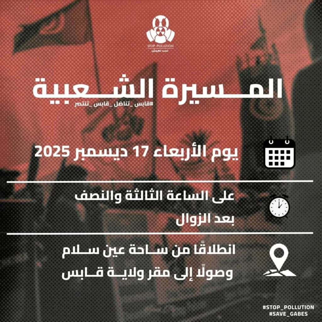 “تفكيك الوحدات” وذلك يوم الأربعاء 17 ديسمبر 2025، على الساعة الثالثة والنصف بعد الزوال، انطلاقًا من ساحة عين سلام وصولًا إلى مقر ولاية ڨابس.