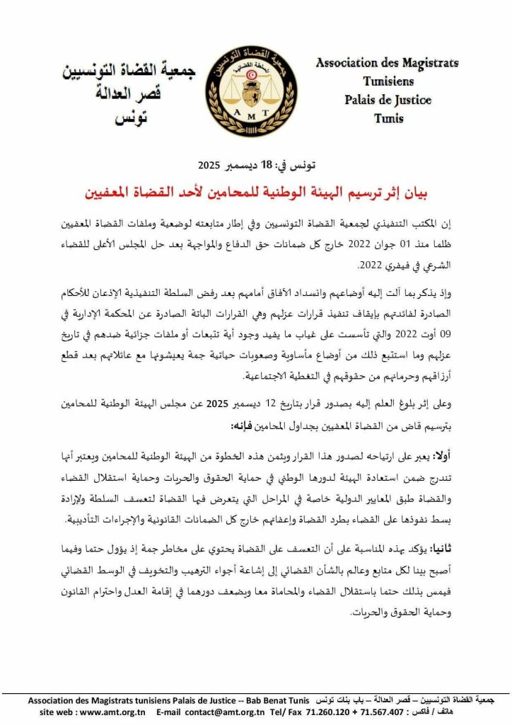“إن المكتب التنفيذي لجمعية القضاة التونسيين وفي إطار متابعته لوضعية وملفات القضاة المعفيين ظلما منذ 01 جوان 2022 خارج كل ضمانات حق الدفاع والمواجهة بعد حل المجلس الأعلى للقضاء الشرعي في فيفري 2022.