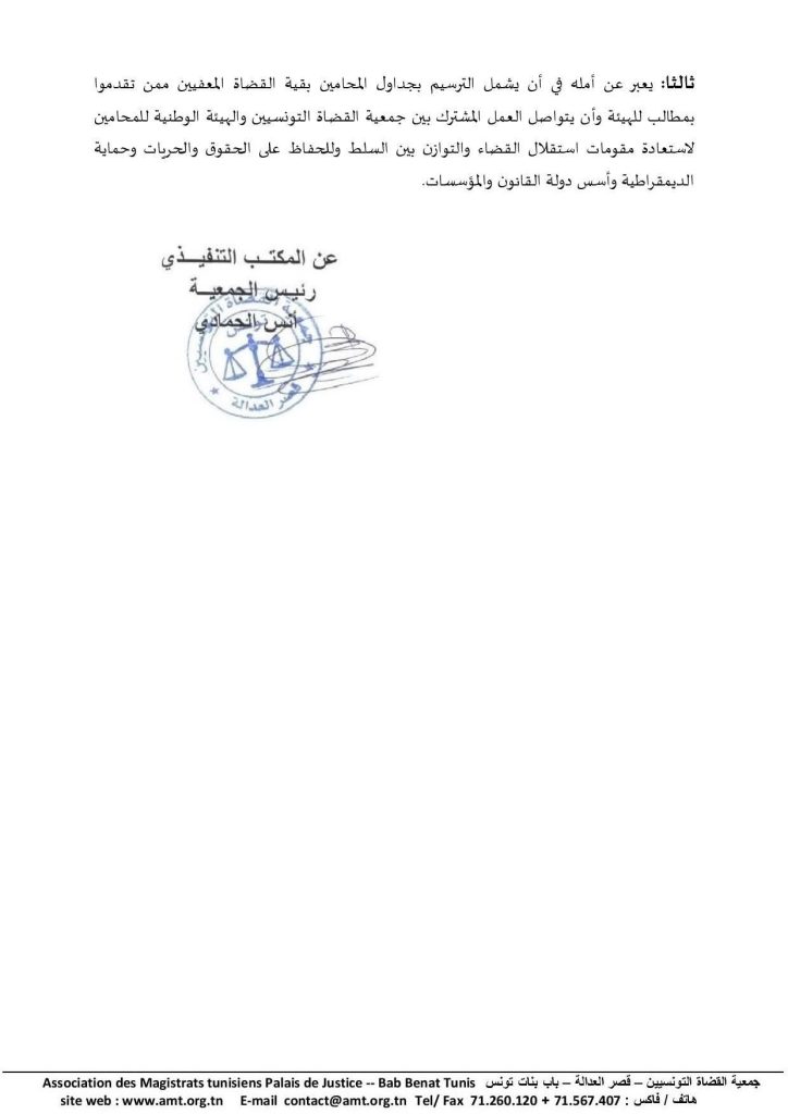 ثالثا: يعبر عن أمله في أن يشمل الترسيم بجداول المحامين بقية القضاة المعفيين ممن تقدموا بمطالب للهيئة وأن يتواصل العمل المشترك بين جمعية القضاة التونسيين والهيئة الوطنية للمحامين لاستعادة مقومات استقلال القضاء والتوازن بين السلط وللحفاظ على الحقوق والحريات وحماية الديمقراطية وأسس دولة القانون والمؤسسات”.