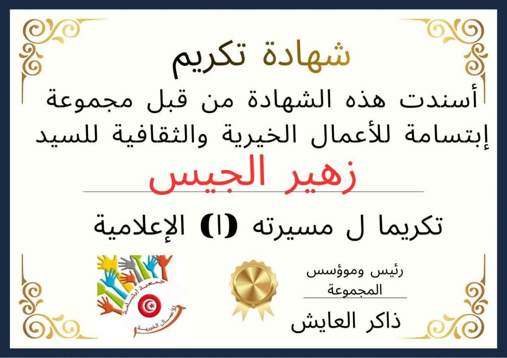 أسندت مجموعة ابتسامة للأعمال الخيرية و الثقافية شهادة للصحفي زهير الجيس تكريما لمسيرته الاعلامية.
