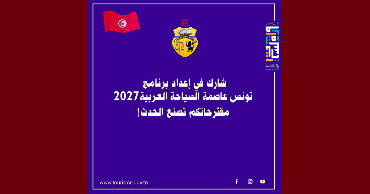 على إثر تتويج تونس عاصمةً للسياحة العربية لسنة 2027، وانطلاقًا من قناعة راسخة بأن هذا التتويج يُمثّل مشروعًا وطنيًا جامعًا، تُعلن وزارة السياحة عن فتح باب المشاركة في إعداد وصياغة برنامج «تونس عاصمة السياحة العربية 2027»، وذلك في إطار مقاربة تشاركية واسعة تهدف إلى ابراز صورة تونس الحديثة، المتنوّعة، والمنفتحة، مع المحافظة على عمقها الحضاري والثقافي.