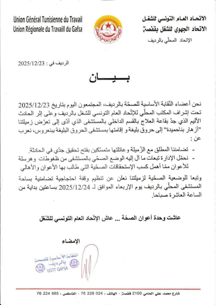 على اثر الحادث الأليم الذي جد بقاعة العلاج بالقسم الداخلي بالمستشفى و أدى إلى تعرض عاملة إلى حروق بليغة استوجبت نقلها إلى مستشفى الحروق البليغة ببن عروس، حمل اتحاد الشغل بقفصة الإدارة تبعات ما آل إليه الوضع الصحي بالمستشى من ضغوطات وهرسلة للاعوان مما أهمل كسب الاستحقاقات الصحية التي طالب بها الأعوان و الأهالي، و تبعا للوضعية الصحية للمتضررة، تم الإعلان عن تنظيم وقفة احتجاجية تضامنية بساحة المستشفى المحلي بالرديف يوم غد الأربعاء 24 ديسمبر بساعتين بداية من الساعة العاشرة صباحا.