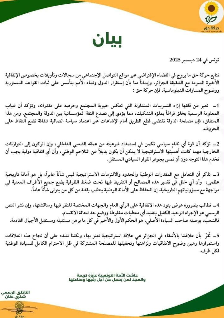 تتابع حركة حق ما يروج في الفضاء الإفتراضي عبر مواقع التواصل الإجتماعي من سجالات وتأويلات بخصوص الإتفاقية الأخيرة المبرمة مع الشقيقة الجزائر. وإيماناً منا بأن إستقرار الدول ونماء الأمم يتأسس على ثبات القواعد الدستورية ووضوح المسارات الدبلوماسية، فإن حركة حق :