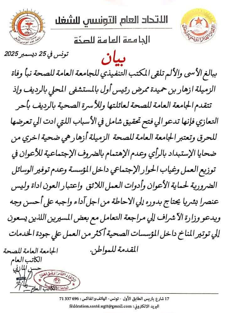 ببالغ الأسى والألم تلقى المكتب التنفيذي للجامعة العامة للصحة نبأ وفاة الزميلة ازهار بن حميدة ممرض رئيس أول بالمستشفى المحلي بالرديف وإذ تتقدم الجامعة العامة للصحة لعائلتها وللأسرة الصحية بالرديف بأحر التعازي فإنها تدعو الي فتح تحقيق شامل في الأسباب اللتي ادت الي تعرضها للحرق وتعتبر الجامعة العامة للصحة الزميلة أزهار هي ضحية اخري من ضحايا الإستبداد بالرأي وعدم الإهتمام بالضروف الإجتماعية للأعوان في توزيع العمل وغياب الحوار الإجتماعي داخل المؤسسة وعدم توفير الوسائل الضرورية لحماية الأعوان وأدوات العمل اللائق واعتبار العون اداة وليس عنصرا بشريا يحتاج بدوره إلي الاحاطة من اجل آداء واجبه على أحسن وجه ويدعو وزارة الآشراف إلي مراجعة التعامل مع بعض المسيرين اللذين يسعون إلي توتير المناخ داخل المؤسسات الصحية أكثر من العمل علي جودة الخدمات المقدمة للمواطن.