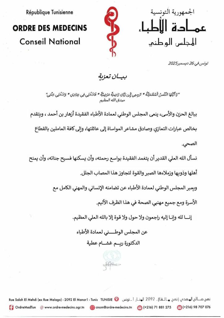 في بيان تعزية صادر عنه اليوم الجمعة 26 ديسمبر، قدم المجلس الوطني لعمادة الأطباء تعازيه لعائلة الفقيدة أزهار و لجميع العاملين في القطاع.