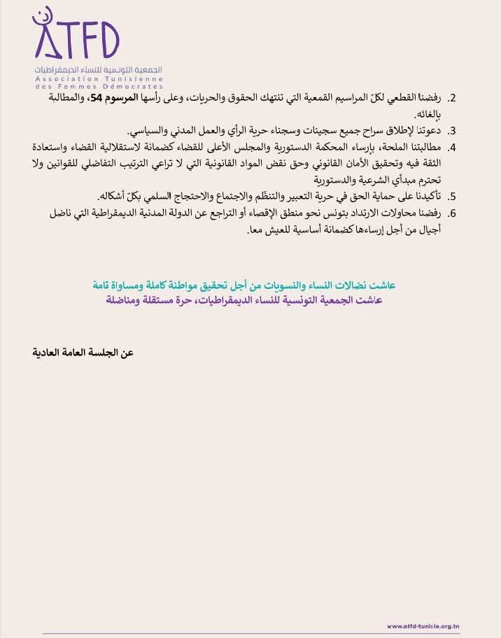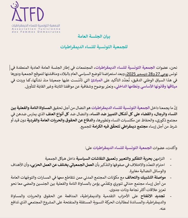 نحن، عضوات الجمعية التونسية للنساء الديمقراطيات، المجتمعـات في إطار الجلسة العامة العادية المنعقدة في تونس يومي 27 و28 ديسمبر 2025، وبعد استعراضنا للوضع السياسي العام بالبلاد، ومناقشتها لتموقع الجمعية ودورها في هذا السياق الوطني الدقيق، نُجدّد التأكيد على المبادئ التي تأسّست عليها جمعيتنا منذ نشأتها، كما وردت في ميثاقها وقانونها الأساسي ونطامها الداخلي، ونعبّر بوضوح وشفافية عن مواقفنا الثابتة وغير القابلة للتأويل.