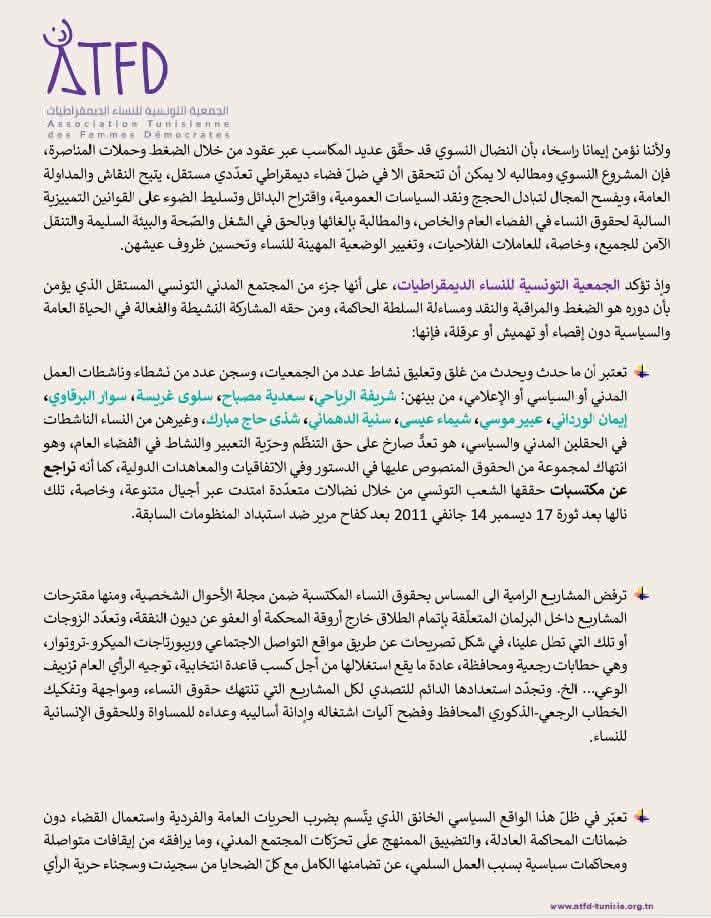 تعتبر أن ما حدث ويحدث من غلق وتعليق نشاط عدد من الجمعيات، وسجن عدد من نشطاء وناشطات العمل المدني أو السياسي أو الإعلامي، من بينهن: شريفة الرياحي، سعدية مصباح، سلوى غريسة، سوار البرقاوي، إيمان الورداني، عبير موسي، شيماء عيسى، سنية الدهماني، شذى حاج مبارك، وغيرهن من النساء الناشطات في الحقلين المدني والسياسي، هو تعدٍّ صارخ على حق التنظّم وحرّية التعبير والنشاط في الفضاء العام، وهو انتهاك لمجموعة من الحقوق المنصوص عليها في الدستور وفي الاتفاقيات والمعاهدات الدولية، كما أنه تراجع عن مكتسبات حققها الشعب التونسي من خلال نضالات متعدّدة امتدت عبر أجيال متنوعة، وخاصة، تلك نالها بعد ثورة 17 ديسمبر 14 جانفي 2011 بعد كفاح مرير ضد استبداد المنظومات السابقة.