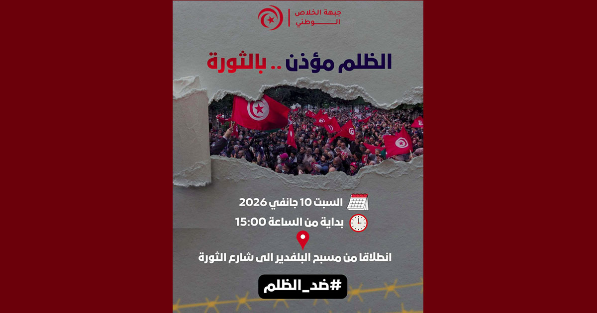 تدعو الجبهة مناضليها ومناضلاتها وعموم المواطنين للمشاركة في المسيرة التي تنتظم يوم السّبت 10 جانفي 2026 على السّاعة 15.00 انطلاقا من مسبح البلفيدير في اتّجاه شارع الحبيب بورڤيبة بمناسبة إحياء الذكرى الخامسة عشر لانتصار ثورة الحرية والكرامة 17 ديسمبر 2010 ، 14 جانفي 2011.