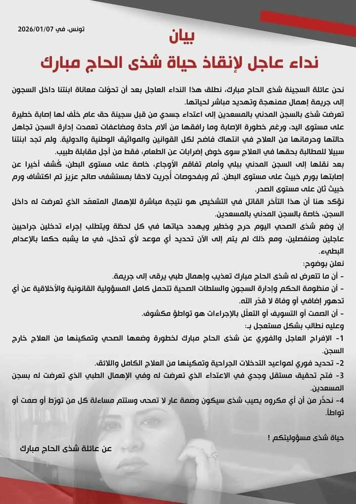 “نحن عائلة السجينة شذى الحاج مبارك، نطلق هذا النداء العاجل بعد أن تحوّلت معاناة ابنتنا داخل السجون إلى جريمة إهمال ممنهجة وتهديد مباشر لحياتها.