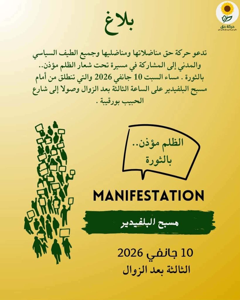 تدعو حركة حق مناضلاتها ومناضليها وجميع الطيف السياسي والمدني إلى المشاركة في مسيرة تحت شعار الظلم مؤذن.. بالثورة . مساء السبت 10 جانفي 2026 والتي تنطلق من أمام مسبح البلفيدير على الساعة الثالثة بعد الزوال وصولا إلى شارع الحبيب بورقيبة