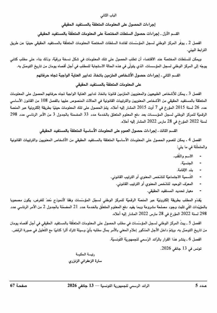 تونسسياسةصدر بالرائد الرسمي: حول آخر قرارات الحكومة250 0 13 يناير، 202613 يناير، 2026 صدور قرار رئيسة الحكومة بتاريخ 13 جانفي 2026 يتعلق بضبط إجراءات الحصول على المعلومات المتعلقة بالمستفيد الحقيقي من الأشخاص المعنيين والترتيبات القانونية (أنظر الوثيقة)