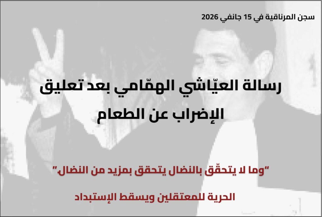 “أنهيتُ اليوم الخميس 15 جانفي 2026 إضرابي عن الطعام وأتوجّه إليكم بهذا البيان بعد أن فرغتُ من آخر ملعقة من ألذّ حساء “برودو” أعدّته لي أمهر طبّاخة في العالم ألا وهي زوجتي الغالية وحيدة.
