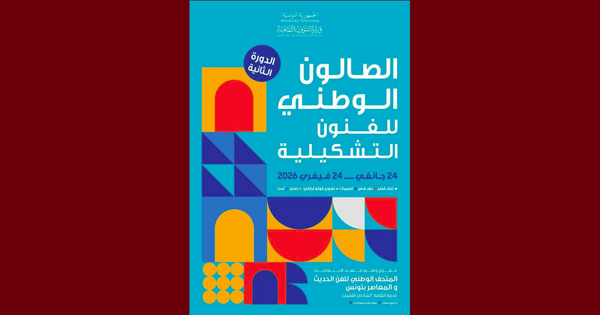 تحت إشراف وزيرة الشؤون الثقافية السيدة أمينة الصرارفي، تنطلق فعاليات الدورة الثانية للصالون الوطني للفنون التشكيلية يوم 24 جانفي 2026 لتتواصل إلى غاية يوم 24 فيفري 2026 وذلك بالمتحف الوطني للفن الحديث والمعاصر بمدينة الثقافة الشاذلي القليبي بتونس العاصمة.