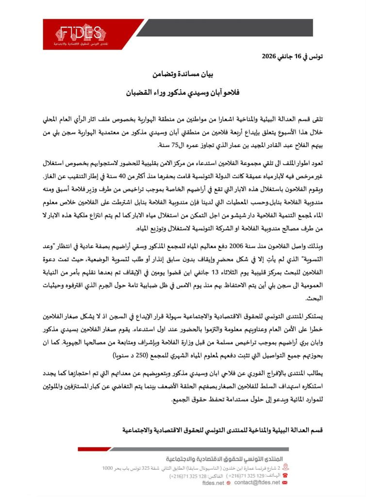 يطالب المنتدى بالإفراج الفوري عن فلاحي ابان وسيدي مذكور وبتعويضهم عن معداتهم التي تم احتجازها كما يجدد استنكاره استهداف السلط للفلاحين الصغار بصفتهم الحلقة الأضعف بينما يتم التغاضي عن كبار المستنزفين والملوثين للموارد المائية ويدعو إلى حلول مستدامة تحفظ حقوق الجميع.