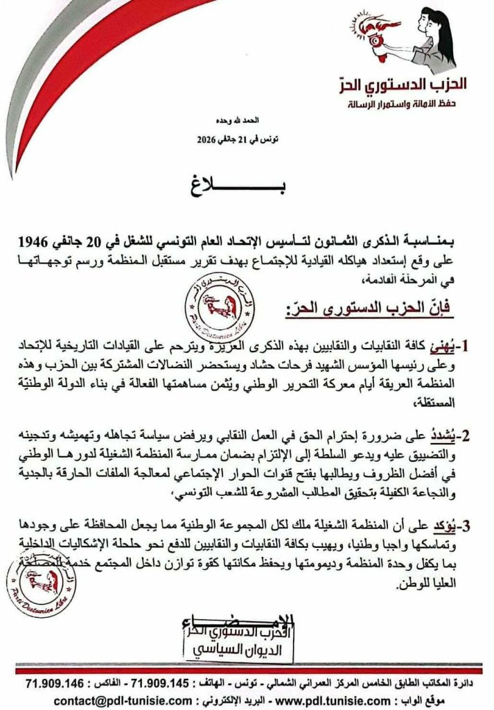 1- يُهنئ كافة النقابيات والنقابيين بهذه الذكرى العزيزة ويترحم على القيادات التاريخية للإتحاد وعلى رئيسها المؤسس الشهيد فرحات حشاد ويستحضر النضالات المشتركة بين الحزب وهذه المنظمة العريقة أيام معركة التحرير الوطني ويُثمن مساهمتها الفعالة في بناء الدولة الوطنيّة المستقلة،