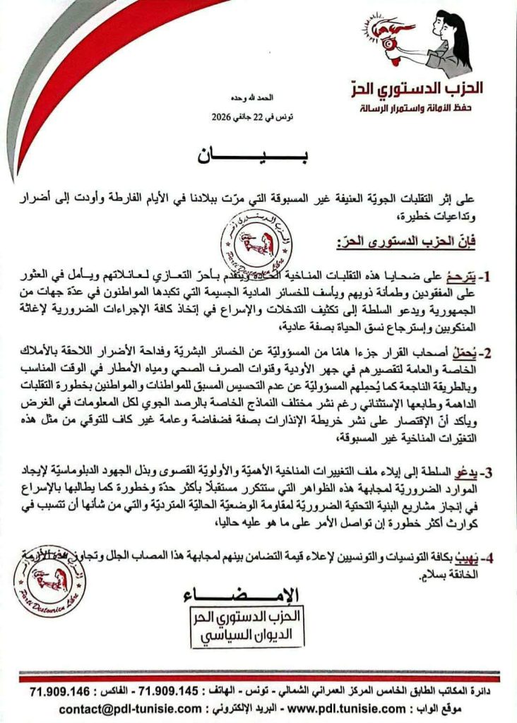 نص بيان الحزب الدستوري الحر بتاريخ 22 جانفي 2026 حول التقلبات المناخية: