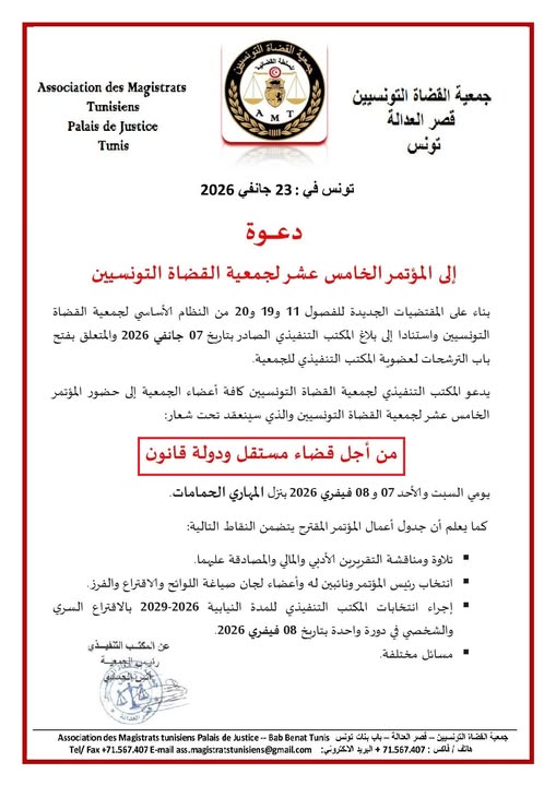 يدعو المكتب التنفيذي لجمعية القضاة التونسيين كافة أعضاء الجمعية إلى حضور المؤتمر الخامس عشر لجمعية القضاة التونسيين والذي سينعقد تحت شعار: