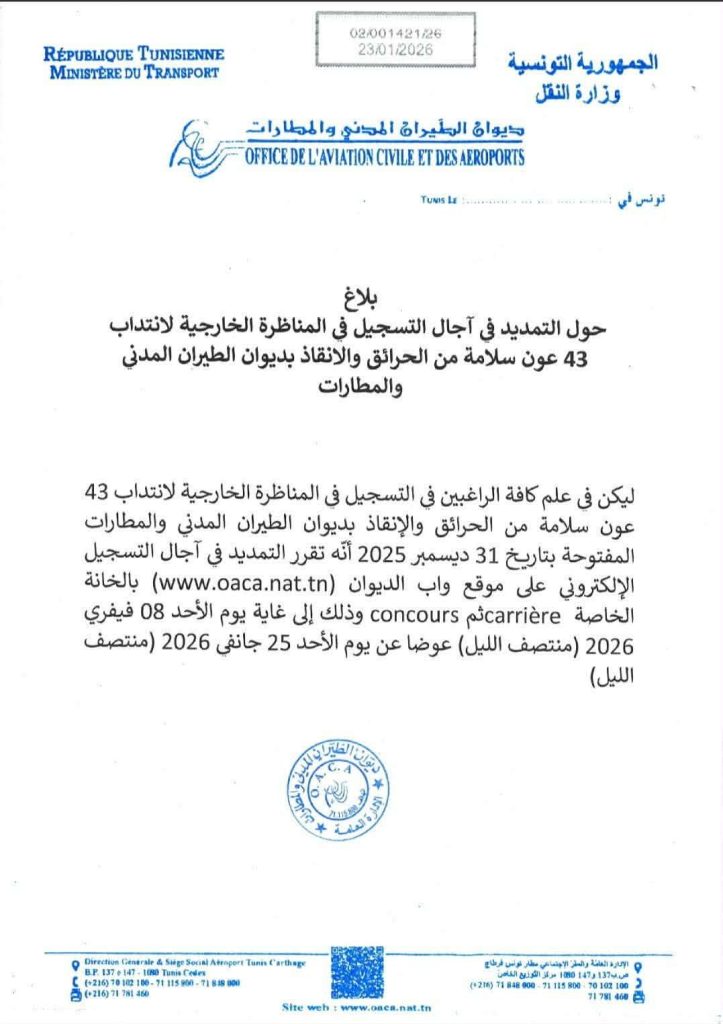 في ما يلي نص البلاغ الصادر بتاريخ اليوم حول التمديد في آجال التسجيل في المناظرة الخارجية لانتداب 43 عون سلامة من الحرائق والانقاذ بديوان الطيران المدني والمطارات الذي أصبج الى غاية يوم الأحد 8 فيفري 2026 عوضا عن يوم الأحد 25 جانفي الجاري.