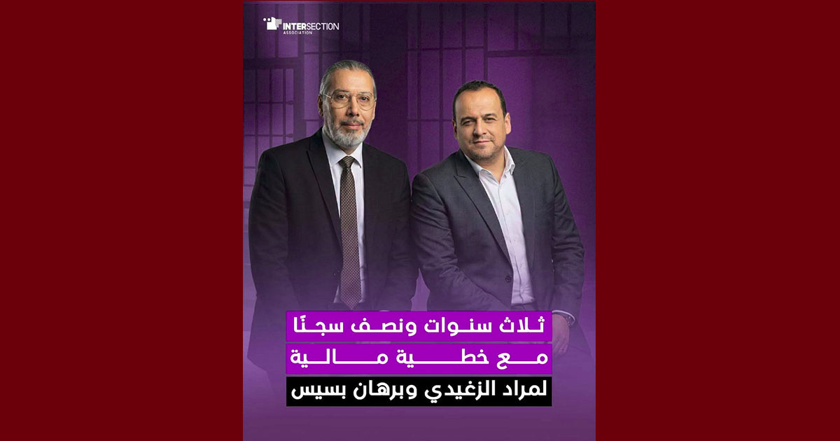 تدين جمعية تقاطع من أجل الحقوق والحريات الحكم الصادر اليوم الخميس 22 جانفي 2026، عن هيئة الدائرة الجنائية بالمحكمة الابتدائية بتونس القاضي بالسجن لمدة ثلاث سنوات ونصف في حق الإعلاميين مراد الزغيدي وبرهان بسيس على خلفية شبهة تبييض الأموال والتهرب الضريبي، مع فرض خطايا مالية إضافة إلى مصادرة الأموال العائدة لهما والحصص الاجتماعية للشركات المساهمين فيها لفائدة الخزينة العامة للدولة التونسية.