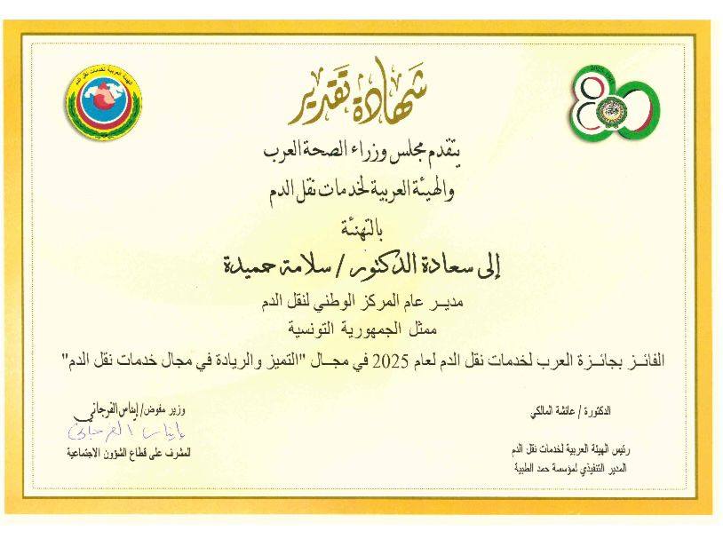 هذا التتويج يعكس مكانة الكفاءات التونسية، ويؤكد حضور تونس عربيًا في دعم الصحة العمومية وتطوير منظومة نقل الدم.