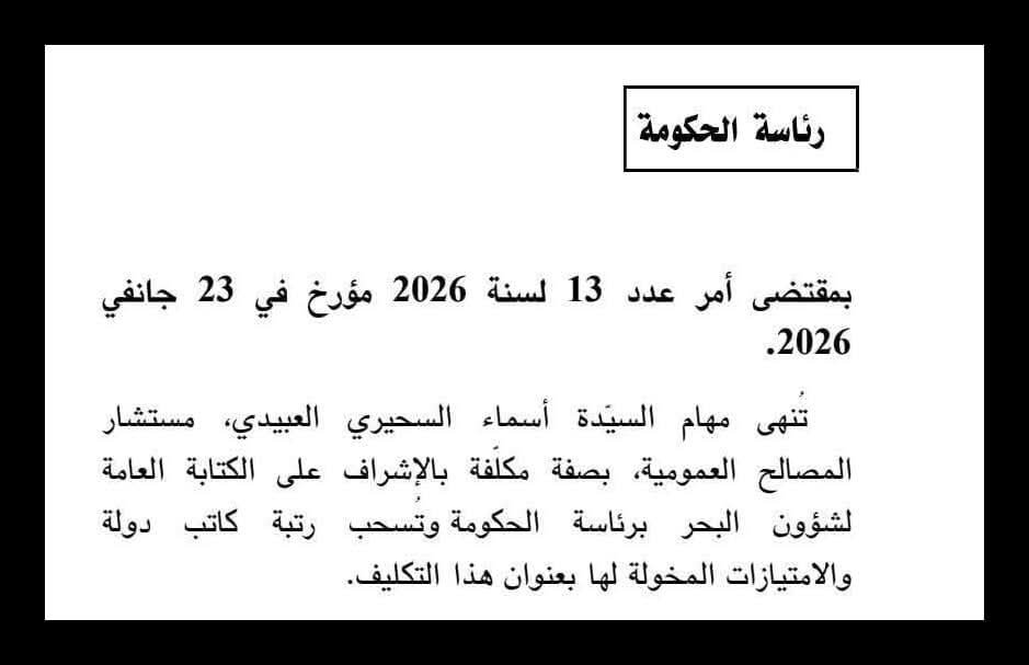 صدر بالرائد الرسمي بتاريخ 23 جانفي 2026 أمر حكومي يقضي بانهاء مهام اسماء السحيري العبيدي من مهمتها كمكلفة بالاشراف على الكتابة العامة لشؤون البحر برئاسة الحكومة مع سحب صفة وامتيازات كاتبة الدولة.