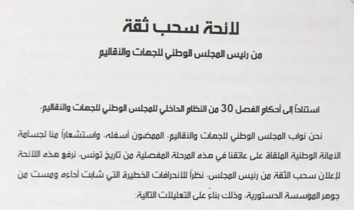 اليوم، وبكل إيمان وثبات، أودعنا بمكتب الضبط المركزي للمجلس الوطني للجهات والأقاليم عريضة سحب الثقة من رئيس المجلس، في خطوة تصحيحية تاريخية يخطّها نواب الشعب المؤمنون بصدق بمسار التحرير الوطني.