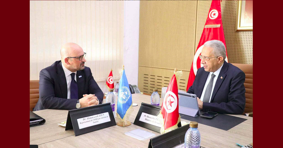 استقبل وزير الصحّة الدكتور مصطفى الفرجاني، صباح اليوم الجمعة 30 جانفي 2026 الدكتور أحمد زويتن، الممثّل بالنيابة لمنظمة الصحّة العالمية في تونس مؤكّد على متانة علاقات التعاون التاريخية والمثمرة التي تجمع تونس بمنظمة الصحّة العالمية.