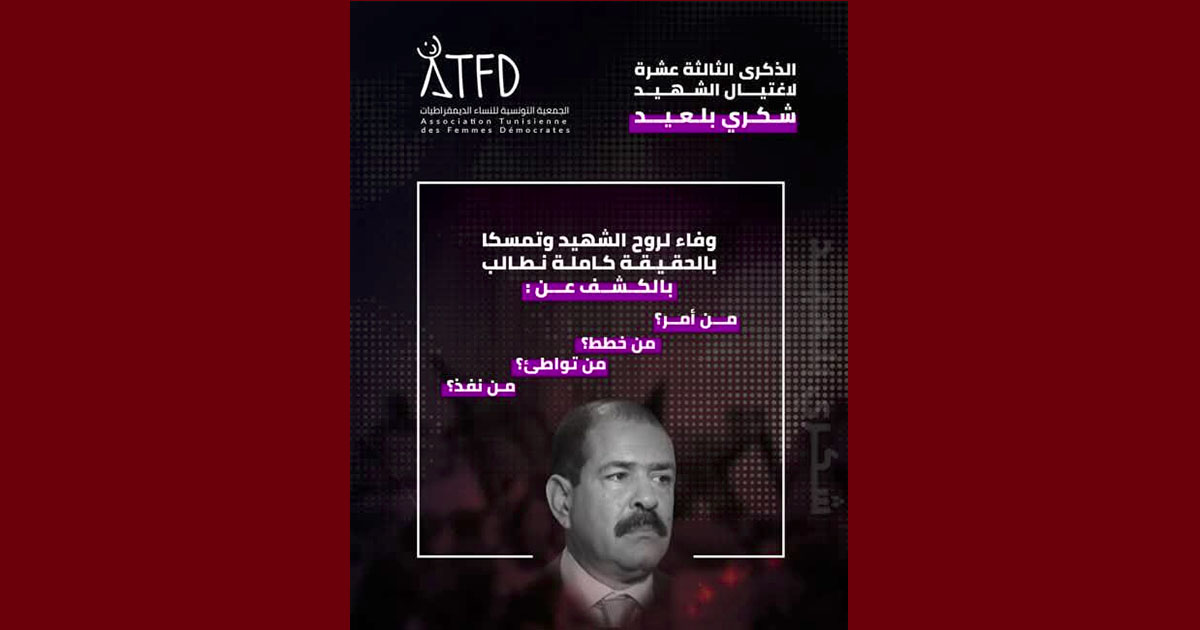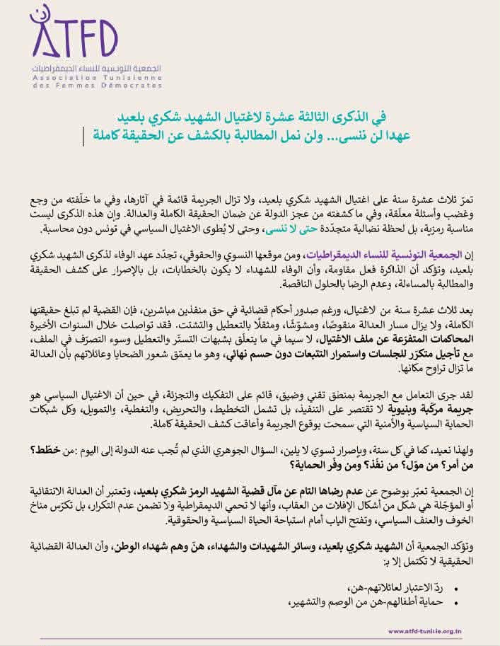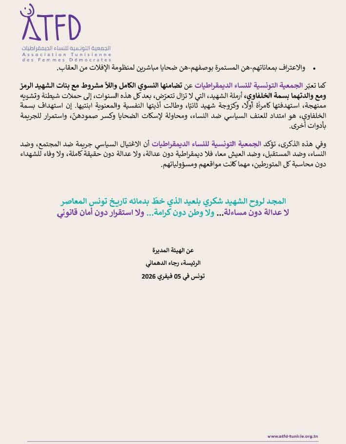 إن الجمعية التونسية للنساء الديمقراطيات، ومن موقعها النسوي والحقوقي، تجدّد عهد الوفاء لذكرى الشهيد شكري بلعيد، وتؤكد أن الذاكرة فعل مقاومة، وأن الوفاء للشهداء لا يكون بالخطابات، بل بالإصرار على كشف الحقيقة والمطالبة بالمساءلة، وعدم الرضا بالحلول الناقصة.