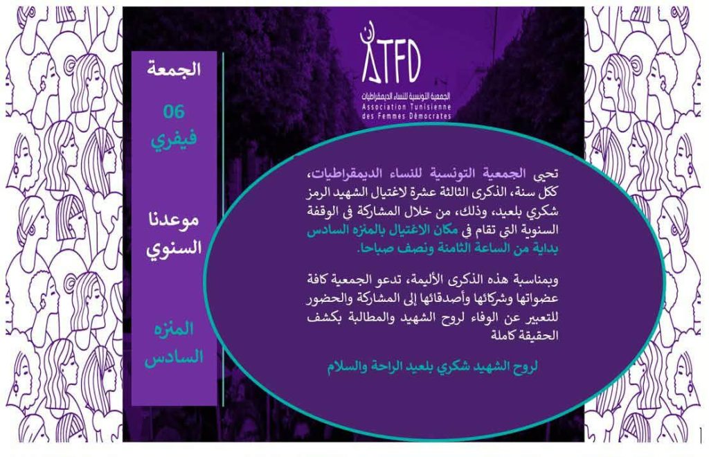 تحيي الجمعية التونسية للنساء الديمقراطيات، ككل سنة، الذكرى الثالثة عشرة لاغتيال الشهيد الرمز شكري بلعيد، وذلك، من خلال المشاركة في الوقفة السنوية التي تقام في مكان الاغتيال بالمنزه السادس بداية من الساعة الثامنة ونصف صباحا، غدا الجمعة 06 فيفري 2026.