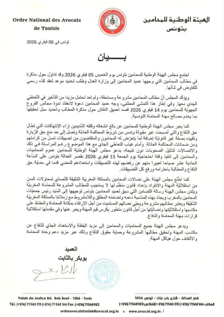 تونسسياسةدفاعا عن حقهم في الدفاع، المحامون يحتجون بقصر العدالة:60 0 6 فبراير، 20266 فبراير، 2026 في بيان نشره اليوم الجمعة على حسابه بصفحات التواصل الإجتماعي، عبر مجلس الهيئة الوطنية للمحامين عن مدى انشغاله بخصوص التضييقات على حق الدفاع و دعا الى وقفة احتجاجية صباح يوم الجمعة 13 فيفري 2026 بقصر العدالة بتونس العاصمة (التفاصيل في وثيقة البيان):